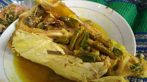 Kuah kuning pekat yang melimpah—dikenal sebagai “gombyang”—memberikan perpaduan rasa gurih, pedas, dan asam, sekaligus menyelimuti daging ikan dengan aroma rempah yang kuat.